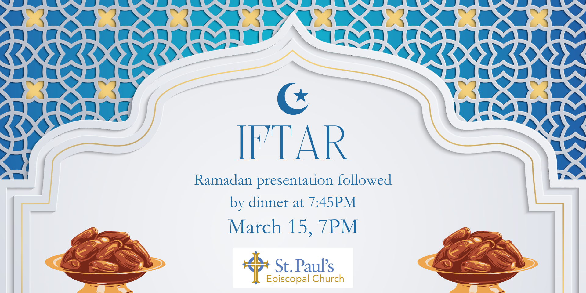 Join together with our Muslim friends on Sunday, March 15 at 7PM for a presentation on the holy month of Ramadan, followed by an iftar (“break-the-fast” dinner) at 7:45PM (sunset). The meal will be catered to ensure that it is halal. St. Paul’s parishioners are asked if possible to contribute $20+ to pay for their own meal and that of a Muslim guest.