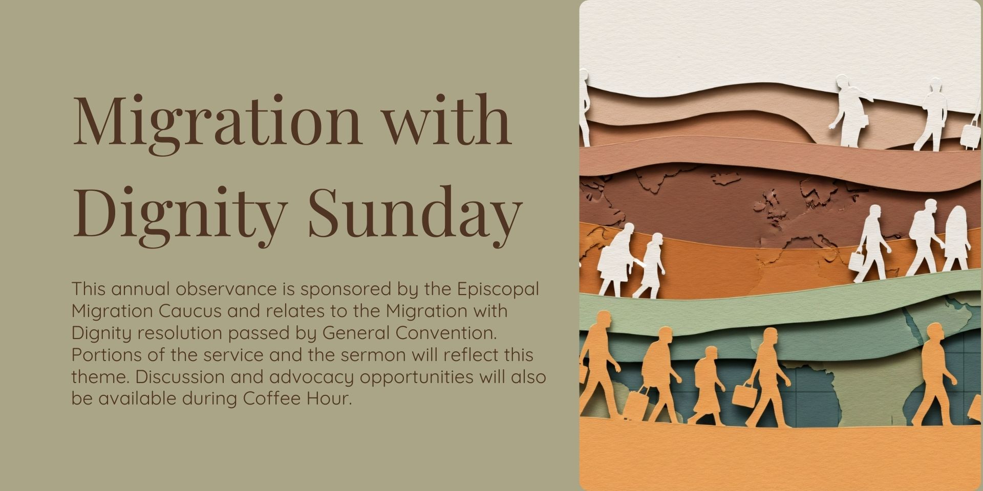 On Sunday, February 1, St. Paul’s will observe “Migration with Dignity,” an annual event sponsored by the Episcopal Migration Caucus. Portions of the service, particularly the Sermon and Prayers of the People, will reflect the ideas in “Migration with Dignity.” The concept of “Migration with Dignity” originated from the resolution passed at General Convention in 2023 and one in process for 2026, “Dignity, Not Hate.” Both resolutions are connected to our Baptismal Covenant.