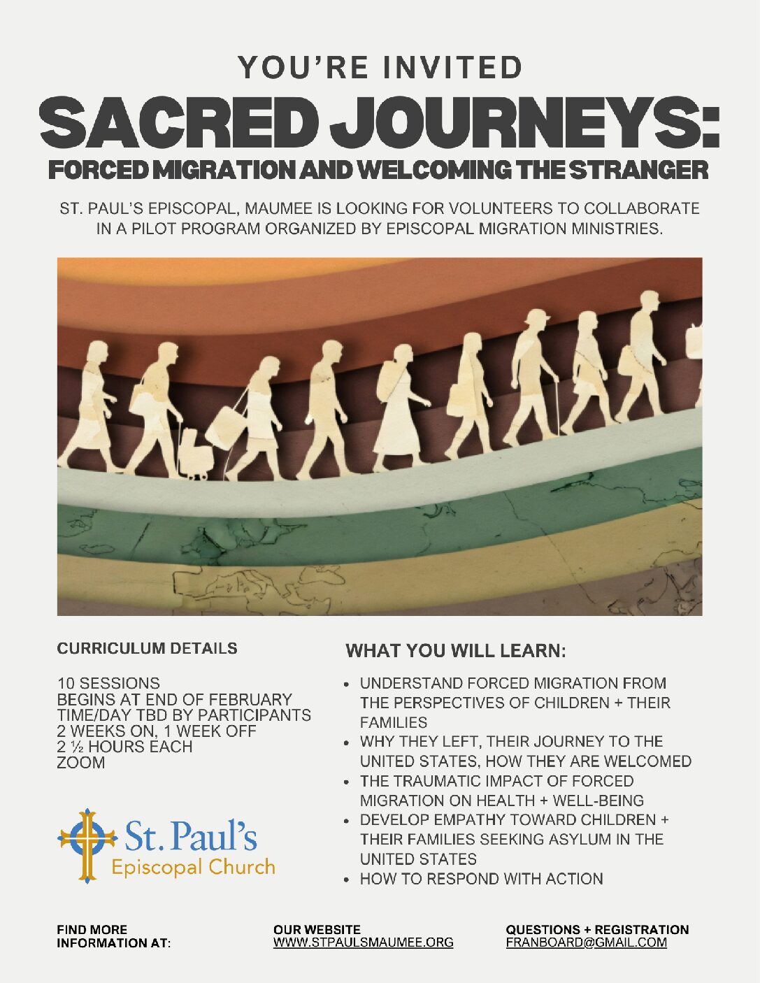 A new opportunity is available for those interested in contributing to the Episcopal Church’s involvement in immigration! Sacred Journeys is a new program, ready for pilot testing starting in February. St. Paul’s Outreach Committee has enthusiastically voted to support this program, and we are looking for volunteers to engage in the pilot. The program has 10 sessions, starting the last week of February. Each session will be 2 1/2 hours, similar to the previous program on racism, “Sacred Ground.” This is the proposed pattern: 2 weeks of sessions followed by 1 week of a break. Groups can choose days and times that work for them. Those of us who engaged in Sacred Ground benefitted immensely from this deepened time for discussion. For more information or to volunteer, notify Fran at franboard@gmail.com. Fran will send you copies of slides describing each session and respond to your questions. Hoping to hear from you!